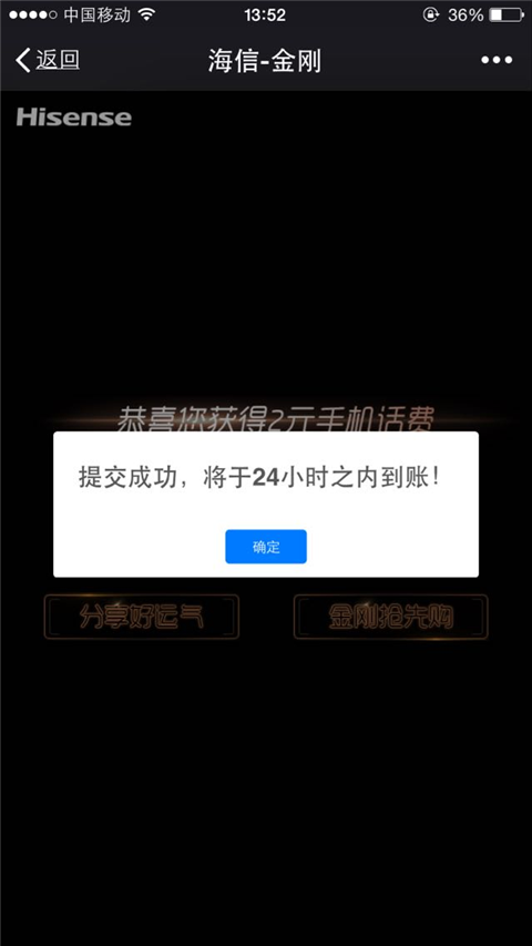 海信官方微信推出“金刚手机问世,10万话费免费送”有奖活动,活动期间,微信关注“海信”官方微信号,登陆活动页面,参与互动活动,即有机会免费赢取话费红包!信哥准备了十万话费红包,先到先得,过期不候\!此活动截止时间不详。